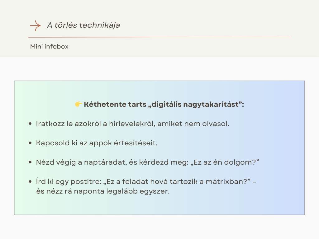 4️⃣ Nem sürgős, nem fontos → Töröld vagy minimalizáld.