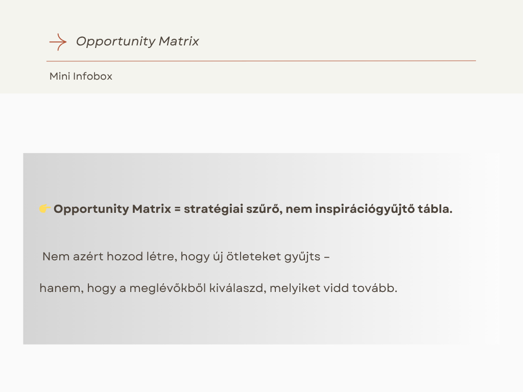 Az Opportunity Matrix (vagyis Lehetőségelemző Mátrix) pontosan erre való. Nem ötletgeneráló, hanem ötlet-szűrő.